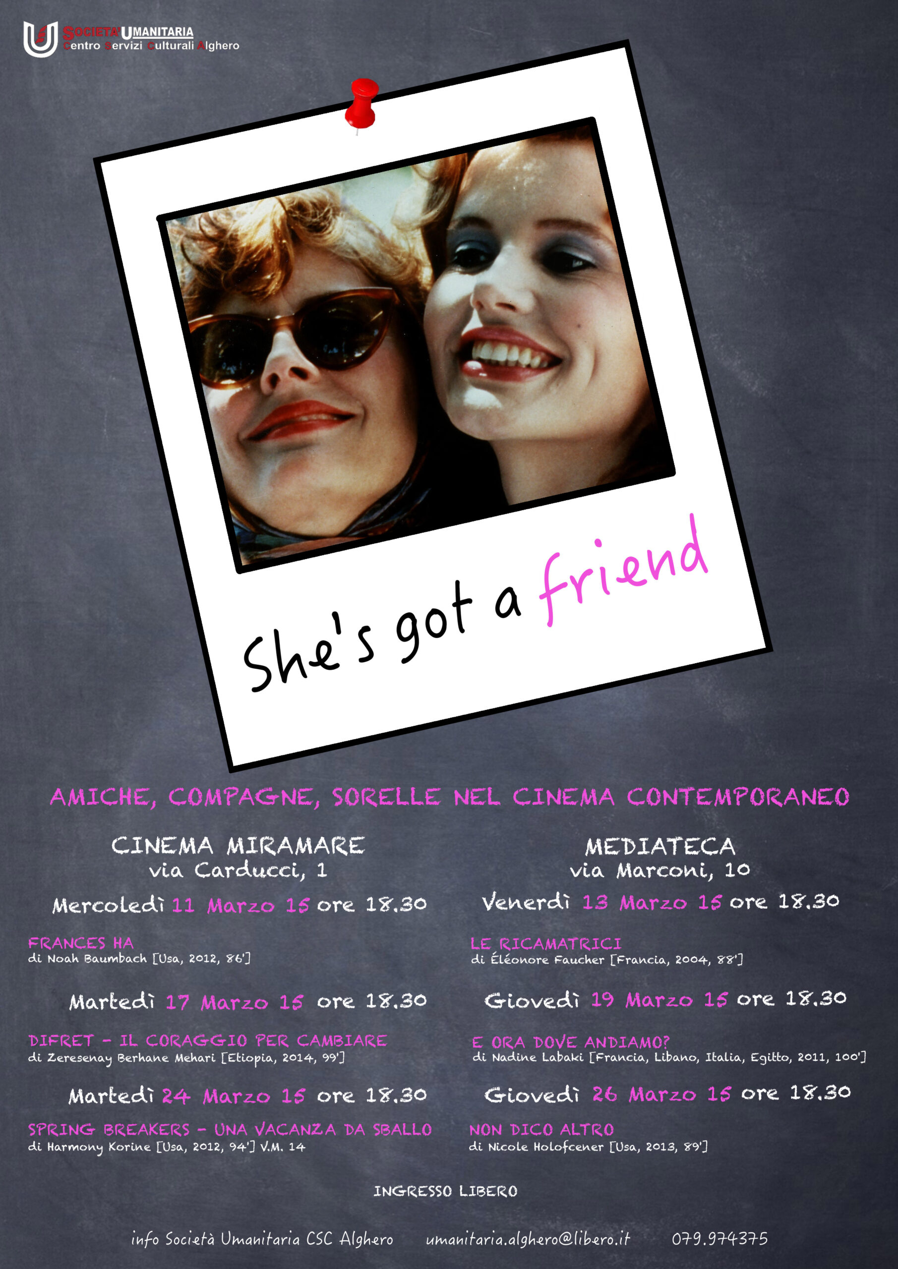 Nella sua autobiografia l’ex musicista punk Richard Hell scrive che «non è l’amore romantico in senso tradizionale che definisce i nostri anni formativi. Mentre entriamo, usciamo o facciamo avanti e indietro dall’adolescenza, quello che definisce i nostri anni di auto-formazione è l’amicizia». A questo legame speciale, faticoso e necessario, la Società Umanitaria di Alghero dedica la sua consueta rassegna di cinema al femminile She’s got a friend, sei film per raccontare storie, relazioni e sim-patie tra amiche, compagne e sorelle del cinema contemporaneo.