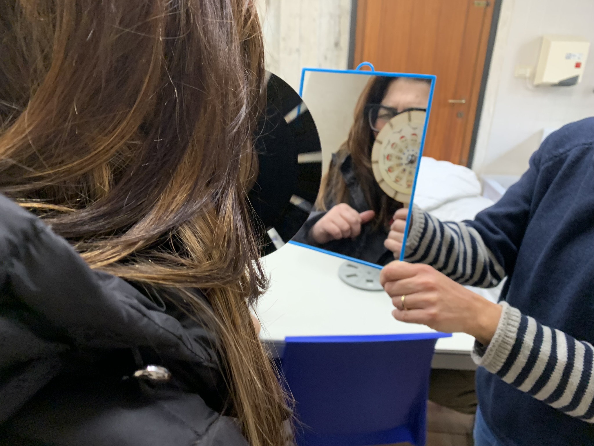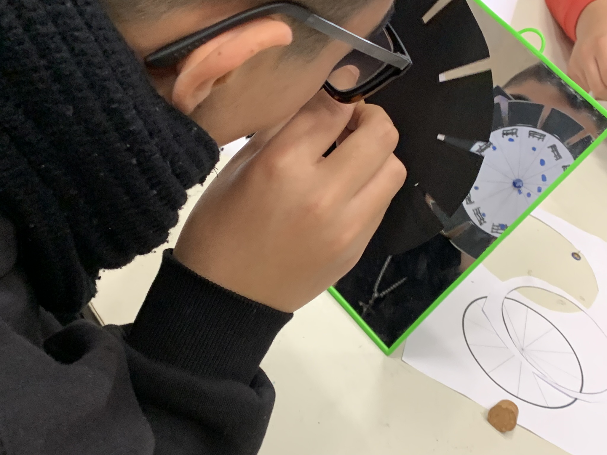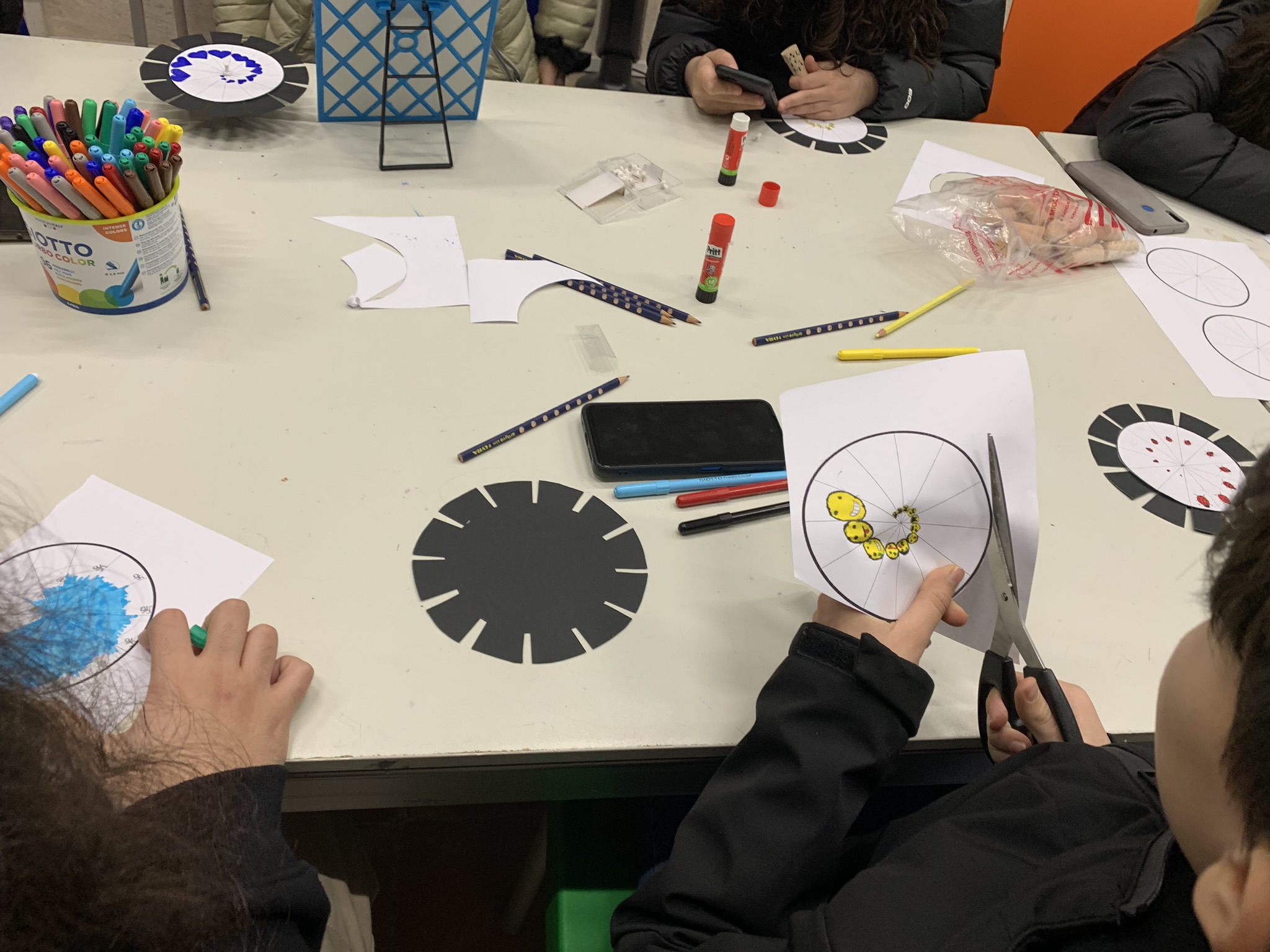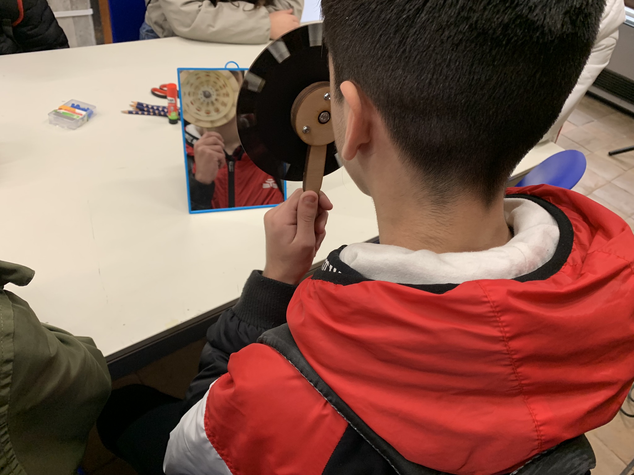 Mettere in funzione il fenachistoscopio per osservare l’illusione del movimento generata dalla rapida successione delle figure.