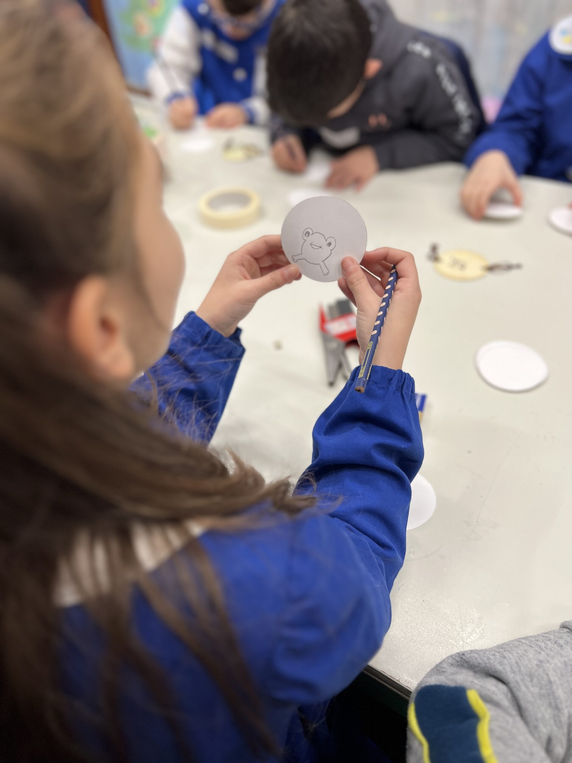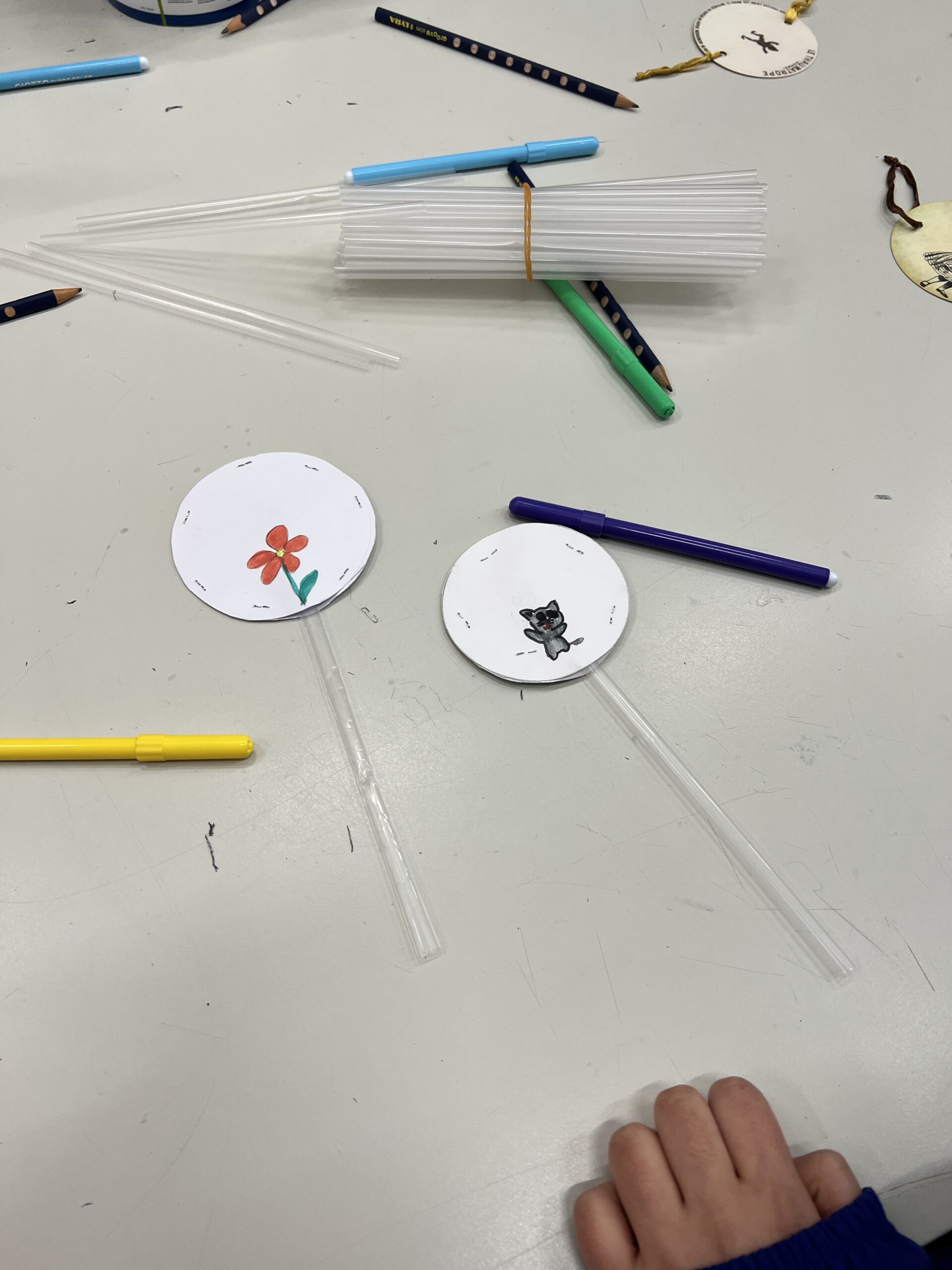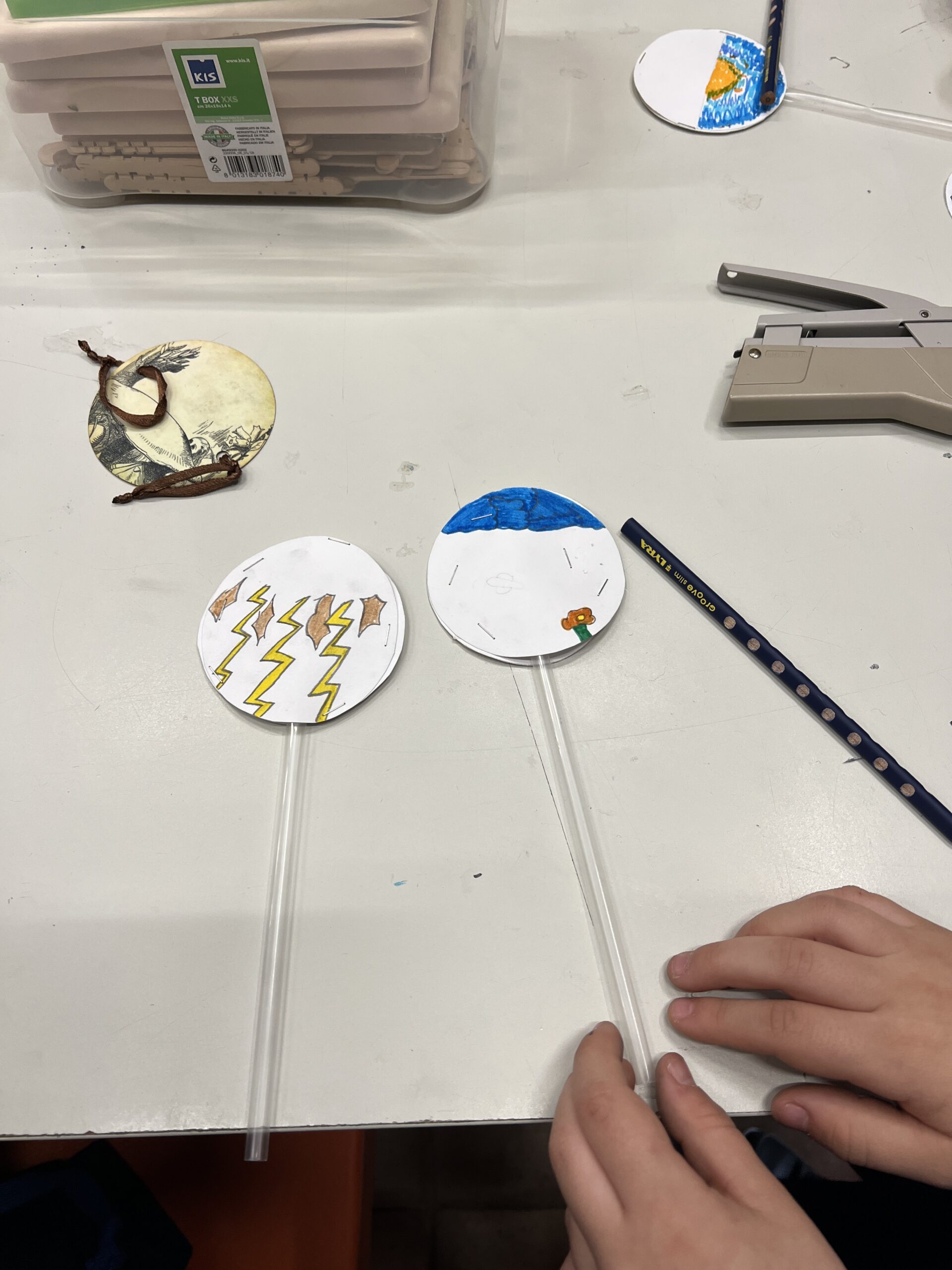 • assemblaggio dei due dischetti e applicazione di un bastoncino (o cannuccia)
