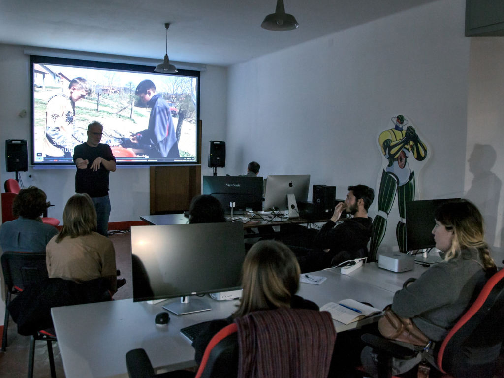 Dopo l’inaugurazione della Fabbrica del Cinema, l’ampio spazio al piano seminterrato ha ospitato per alcuni anni mostre d’arte e fotografia. Dal 2017, con l’avvio del progetto cineportuale, è diventato scenario di diverse attività formative (workshop, corsi e laboratori legati ai mestieri del cinema). Dato l’intensificarsi e stabilizzarsi di queste iniziative, si è reso necessario ridestinare lo spazio e farne una vera e propria aula didattica, dotata di service audiovideo autonomo e postazioni Mac Studio.
