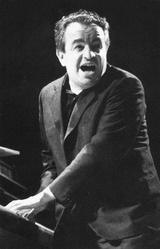 Vorrei però ricordare un’altra strana forma di spettacolo, dello stesso periodo, che ho sempre collegato al lavoro di mio padre per il Teatro del Popolo, ma della quale negli archivi dell’Umanitaria non c’è traccia: le serate in certe cooperative della periferia e dell’hinterland milanese, Quarto Oggiaro, il Ticinese, via Ripamonti… In locali dignitosamente poveri, qualche volta ma non sempre con una pedana e davanti a un pubblico di cinque pensionati, otto operai e tre impiegate, mio padre cantava accompagnandosi al piano canzoni scritte più o meno all’impronta su temi ‘sociali’ (la scuola, la mutua, il caporeparto cattivo, il controllo delle nascite…) e d’attualità (il papa che per la prima volta aveva preso l’aereo). Intanto, due attori in calzamaglia nera – Roberto Pistone e Maresa Meneghini – mimavano le storie raccontate, sempre paradossali e di solito mai a lieto fine. Seguivano, naturalmente, appassionati ma allegri dibattiti.