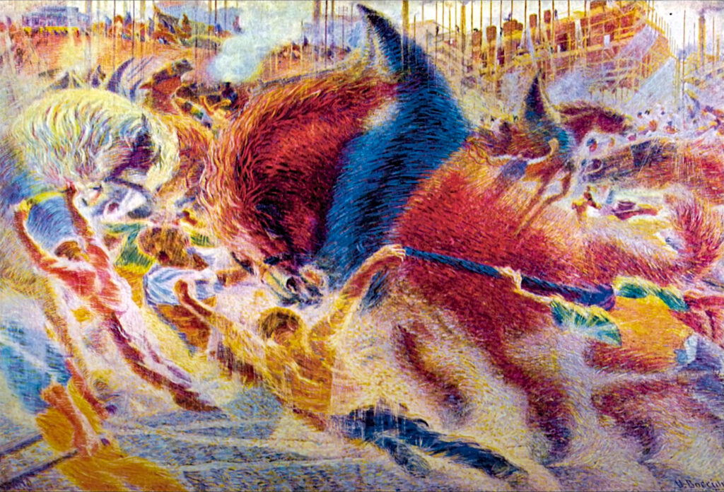 Nell’estate del 1910 il ventottenne Boccioni approda a Milano, proveniente da un lungo soggiorno nella Ville Lumière, e qui viene catturato da nuovi fremiti, altri ritmi e altre prospettive.