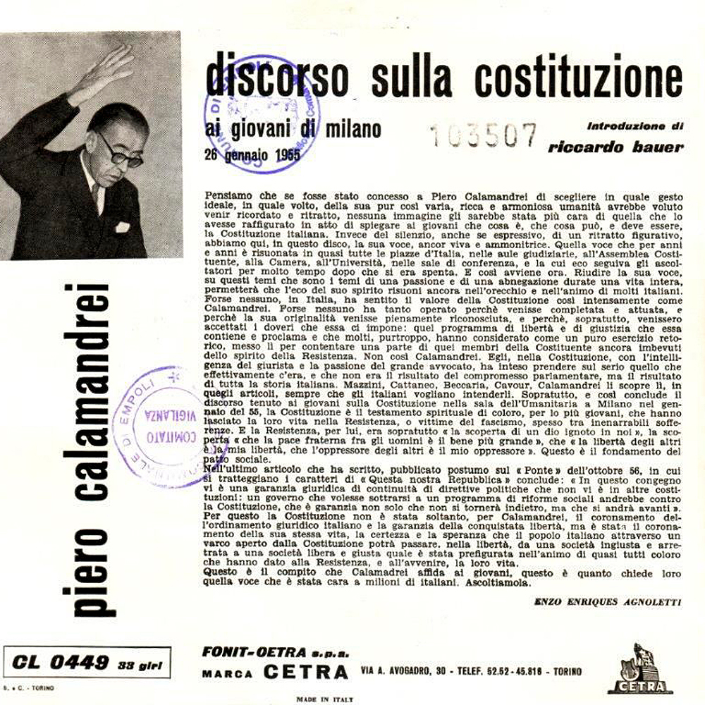 Calamandrei concludeva dicendo che dietro gli articoli della Costituzione “ci sono giovani come voi fucilati, impiccati, portati a morire in campi di concentramento. Questa non è una carta morta, ma il testamento di 100.000 morti per la libertà. Se volete andare in pellegrinaggio dove è nata la nostra Costituzione, andate sulle montagne, nelle carceri, nei campi, dovunque è morto un italiano per riscattare la nostra libertà, perché è lì che è nata questa nostra Costituzione.”