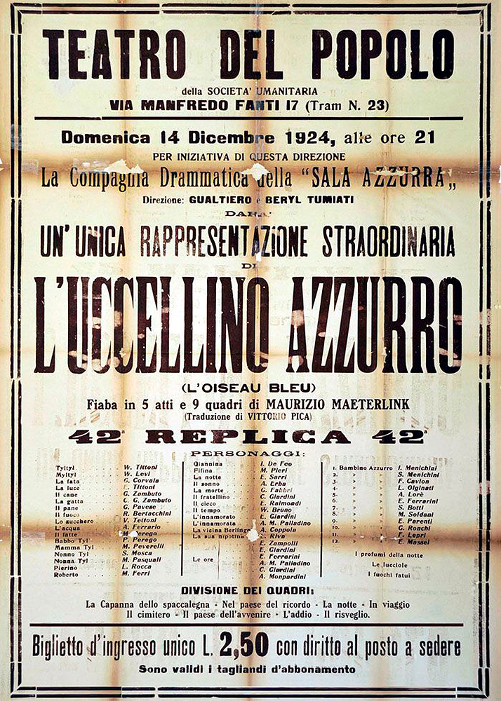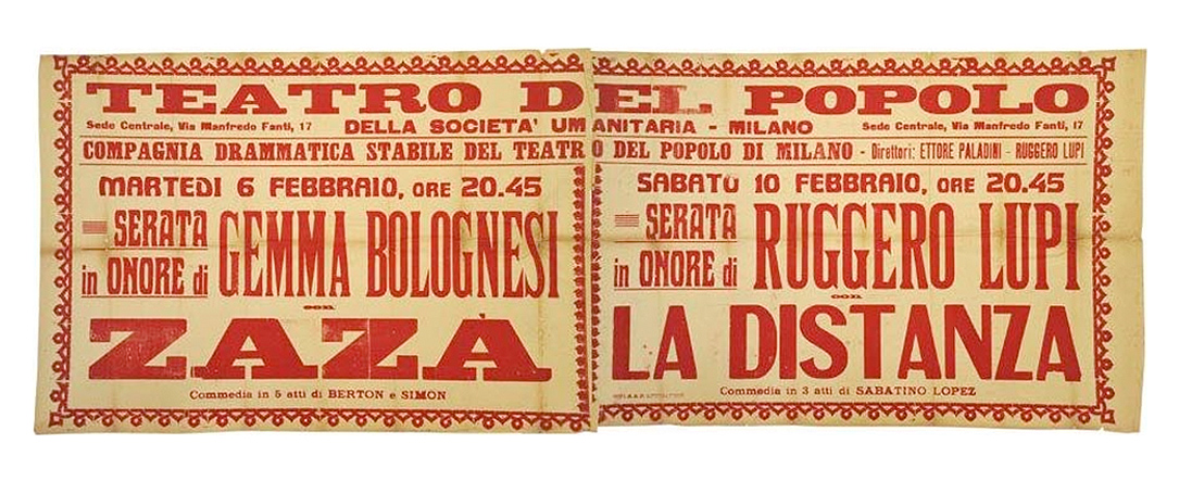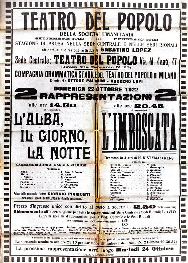 Quando si parla di rappresentazioni teatrali al Teatro del Popolo (nel complesso, dal 1911 al 1926, si tennero oltre 1.400 spettacoli!) non c’è che l’imbarazzo della scelta… Il parterre de rois di grandi attori, registi e drammaturghi che si avvicendarono sul palco di via Manfredo Fanti, oppure davanti alla platee dei piccoli teatri rionali (prima esperienza di teatro decentrato in Milano, negli anni Venti), fu a dir poco straordinario.