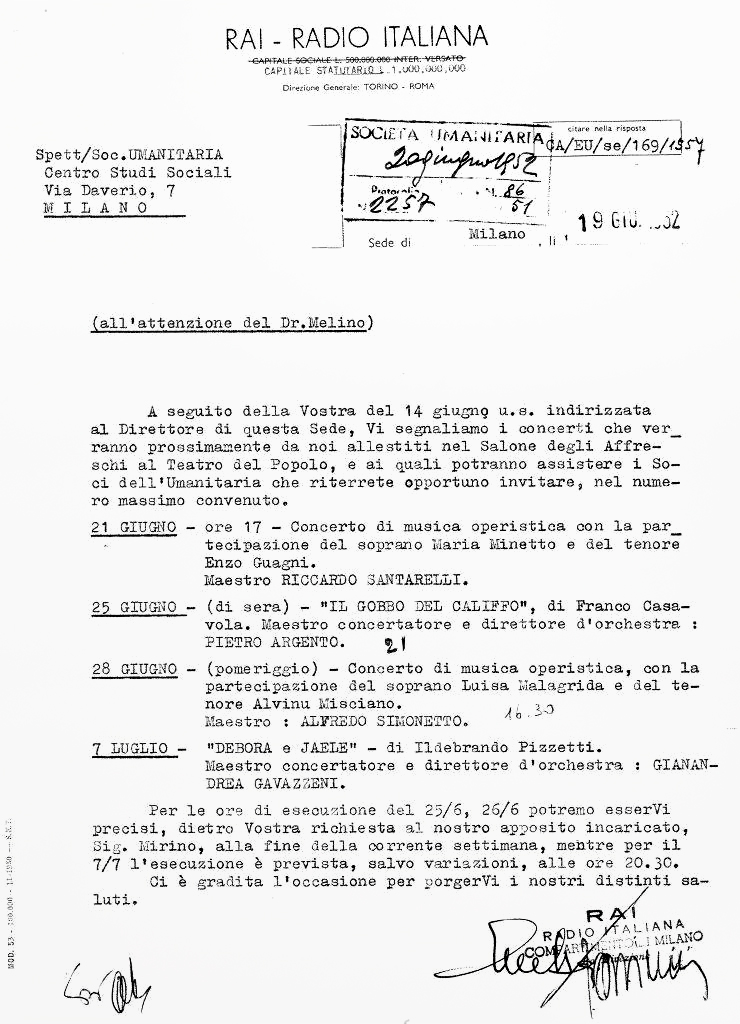 La Rai era stata a fianco del Teatro del Popolo fin dai primi anni della sua programmazione: già troviamo nel palinsesto Rai (al tempo si chiamava URI) del 5 febbraio 1927 la messa in onda dal Salone degli Affreschi della “Commemorazione beethoveniana” degli allievi delle scuole dell’Umanitaria e via via nel tempo fino al ciclo di sei concerti commemorativi di Bach sulla Rete Azzurra del 1950. L’anno successivo il cartellone del Teatro del Popolo si arricchì di un’altra importante collaborazione: una serie di concerti presso il Piccolo Teatro, in cui si esibirono i Complessi strumentali da camera dell’Orchestra della Radio di Milano con musiche comprendenti un repertorio vastissimo: Haydn, Britten, Roussel, Mozart, Khachaturian, Schostakovich, Bach, Bettinelli, Beethoven.