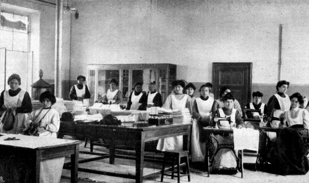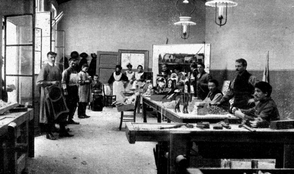 Affidata alla direzione di una figura mitica dell’assistenza milanese, Alessandrina Ravizza, ancora nel pieno delle forze nonostante fosse ormai avanti negli anni (era nata due anni prima delle Cinque Giornate), la Casa di Lavoro accoglieva per un periodo pari a tre settimane, uomini e donne disoccupati, offrendo, nell’attesa che questi trovassero nuove occupazioni, un letto, cibo e lavoro. L’istituto si strutturava in cinque diversi reparti, adibiti a confezione e riparazione di biancheria, scritturazione di indirizzi/copisteria, giocattoli, cartotecnica e falegnameria. In questi ultimi due reparti si avviò, a partire dal 1908, la produzione del materiale didattico e del mobilio commissionato da tutte le Case di Bambini d’Italia.
