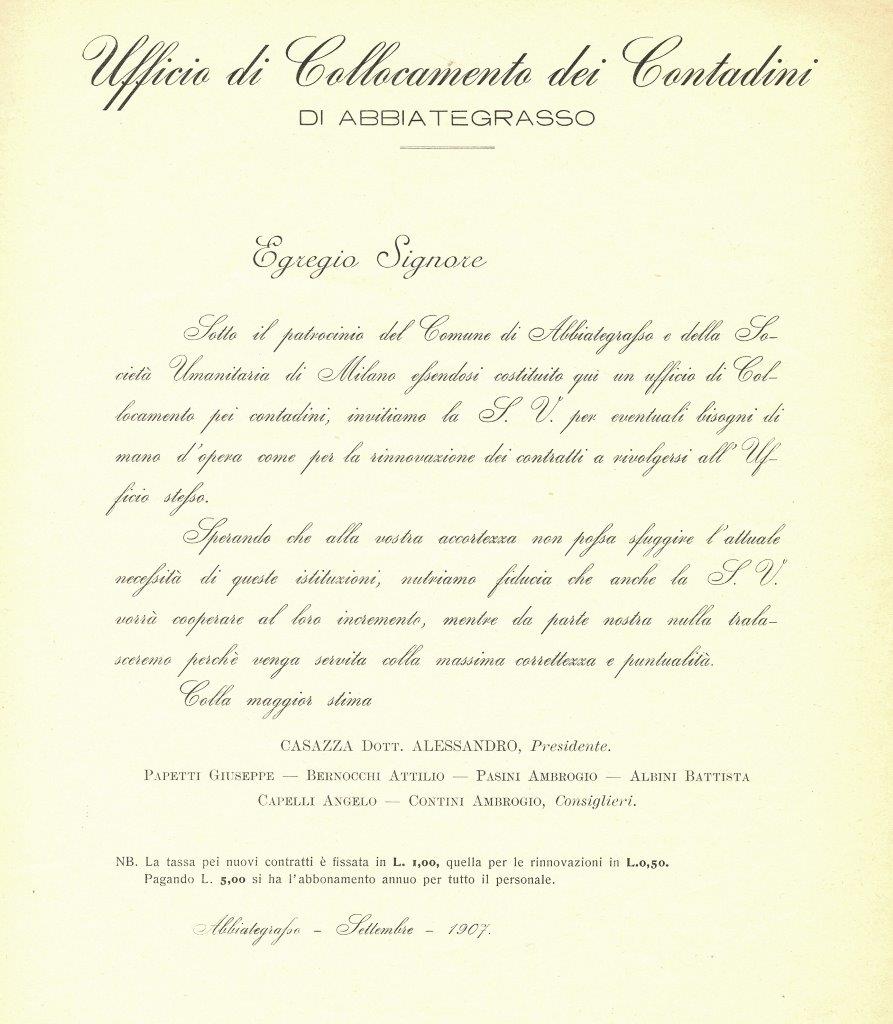 Sorto nell’estate del 1907 con l’obiettivo di potersi “sostituire ai mediatori” e dedicarsi “alla preparazione dei contratti” per coloro che avrebbero “eventualmente” trovato un’occupazione nella zona”, l’Ufficio di Abbiategrasso decollò rapidamente, riuscendo a superare le diffidenze che ogni nuova istituzione incontrava al muovere dei primi passi.