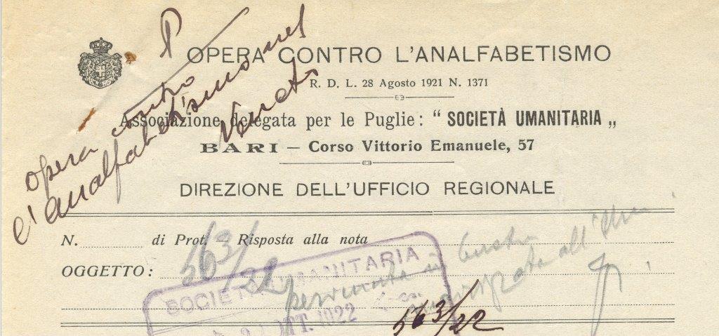 Ripartiamo un estratto dedicato alla sede di Bari, tratto dal volume sulla storia dell’Umanitaria del 1922: