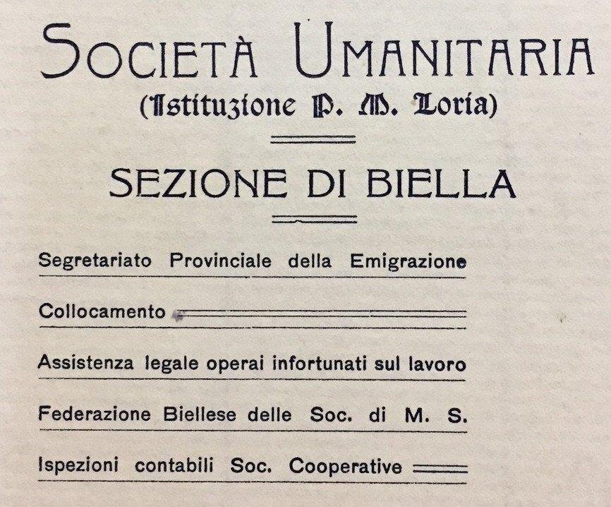 Nel 1908 il Segretariato dell’Emigrazione veniva trasformato nella Sezione di Biella, direttamente dipendente dall’Umanitaria, i cui scopi venivano concordati con il preciso intendimento di ampliare gli orizzonti del lavoro da svolgersi in favore degli emigranti e delle classi operaie, espandendo ogni possibile intervento sociale: dalla consulenza medico-legale (nel 1918 l’ufficio fu riconosciuto dal Ministero per l’Industria Commercio e Lavoro) al collocamento, dall’istruzione popolare e professionale (con la diffusione del libro mediante l’Unione delle Biblioteche popolari e scolastiche) alle più idonee forme di mutualità e previdenza. Fu patrocinata l’assistenza agli operai infortunati sul lavoro e promosse sinergie con le organizzazioni operaie; fu dato impulso all’ufficio di collocamento e favorite le cooperative, curandone la regolarizzazione e l’iscrizione alla Cassa di Previdenza, insomma venne promossa ogni forma e servizio atto a migliorare intellettualmente ed economicamente il Quarto Stato.