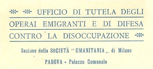 Il numero del 24 febbraio 1908 dell’house-organ “L’Umanitaria” fornisce una scheda riassuntiva della sede di Padova, appena inaugurata: “la Sezione padovana sorge per attuare un deliberato dell’Amministrazione comunale col quale si impostavano in Bilancio L. 5.000 per provvedimenti a favore della disoccupazione. Emanazione del Comune di Padova, della Cassa di Risparmio, delle Societa Mutue e Cooperative, della Camera del Lavoro e della Camera di commercio, la Sezione si propone di funzionare come Segretariato per la tutela dell’emigrazione all’estero, per la tutela dell’emigrazione interna, per il collocamento dei lavoratori agricoli, come Cassa di sussidio alla disoccupazione, secondo le norme seguite dall’Umanitaria, il cui appoggio è doveroso e utile perché col sacrificio modesto della nostra Istituzione, e col concorso di Enti diversi, si raggiungono, con opera coordinata in altre città, gli scopi che l’Umanitaria questa si propone di raggiungere per il miglioramento tecnico, morale ed economico dei lavoratori”.