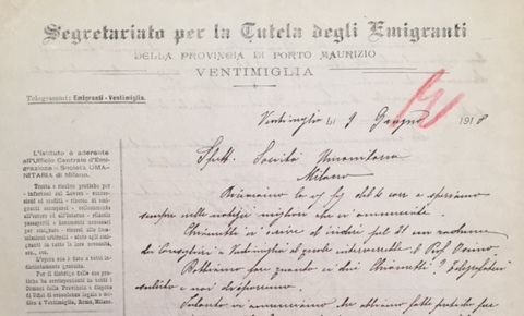 L’Ufficio di Ventimiglia venne costituito nel giugno del 1917, dopo che per anni le amministrazioni locali ed il Regio Commissariato d’Emigrazione avevano lungamente vagheggiato la nascita di un Segretariato dell’Emigrazione che, nella città sulla più importante linea di traffico viaggiatori tra l’Italia meridionale, la Toscana, la Liguria e la Francia, ponesse fine a soprusi e angherie a cui erano continuamente sottoposti i nostri emigranti, senza alcuna istituzione che potesse assicurarne una minima assistenza.