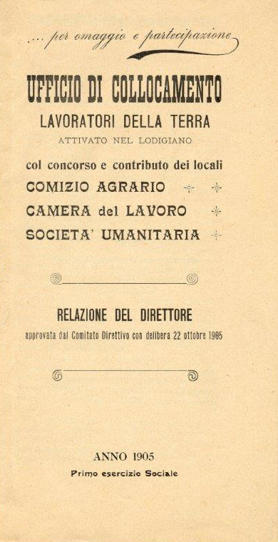 Nel 1905 l’Ufficio Agrario dell’Umanitaria fornì un contributo di rilievo alla nascita di una serie di uffici di collocamento per lavoratori dei campi a Lodi, Abbiategrasso, Codogno, Binasco, Melegnano, Melzo e persino a Milano. Insieme alle cooperative, gli uffici di collocamento nelle campagne dovevano svolgere un ruolo decisivo per l’elevazione delle plebi rurali. Gli uffici infatti non si limitarono a collocare la mano d’opera, contribuendo in tal modo a ridurre la disoccupazione, ma fecero anche un’opera “di tutela e di assistenza ai coloni collocati”, impegnandosi a fondo sia per risolvere le controversie tra datori di lavoro e lavoratori sia per far rispettare ai fittabili i patti colonici e per far pagare indennizzi agli inadempienti, cercando anche di migliorare gradualmente le condizioni delle abitazioni dei contadini, che non facevano certo invidia a quelle che si vedevano nelle più misere e nelle più arretrate regioni d’Italia.