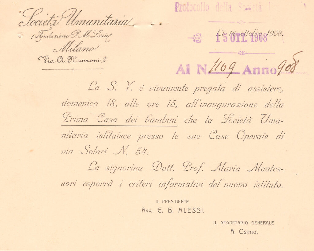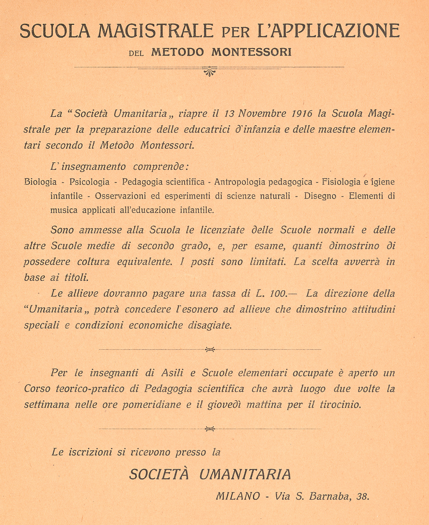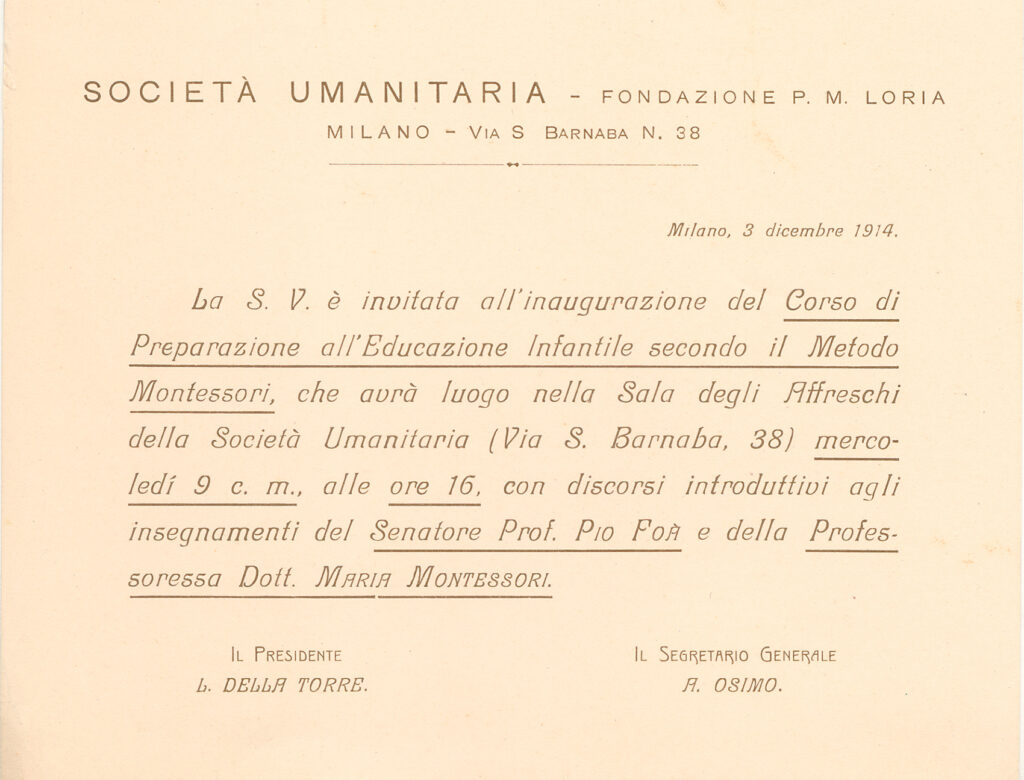 Sotto l’egida di Maria Montessori, nasce la prima Casa dei Bambini della Lombardia, nel quartiere operaio Solari. L’anno successivo, si inaugura quella nel quartiere Lombardia e, nel 1914, quella nella sede dell’Umanitaria. Il sodalizio con la Montessori prosegue negli anni sia per la fabbricazione dei materiali montessoriani, sia per la preparazione delle educatrici per l’infanzia.