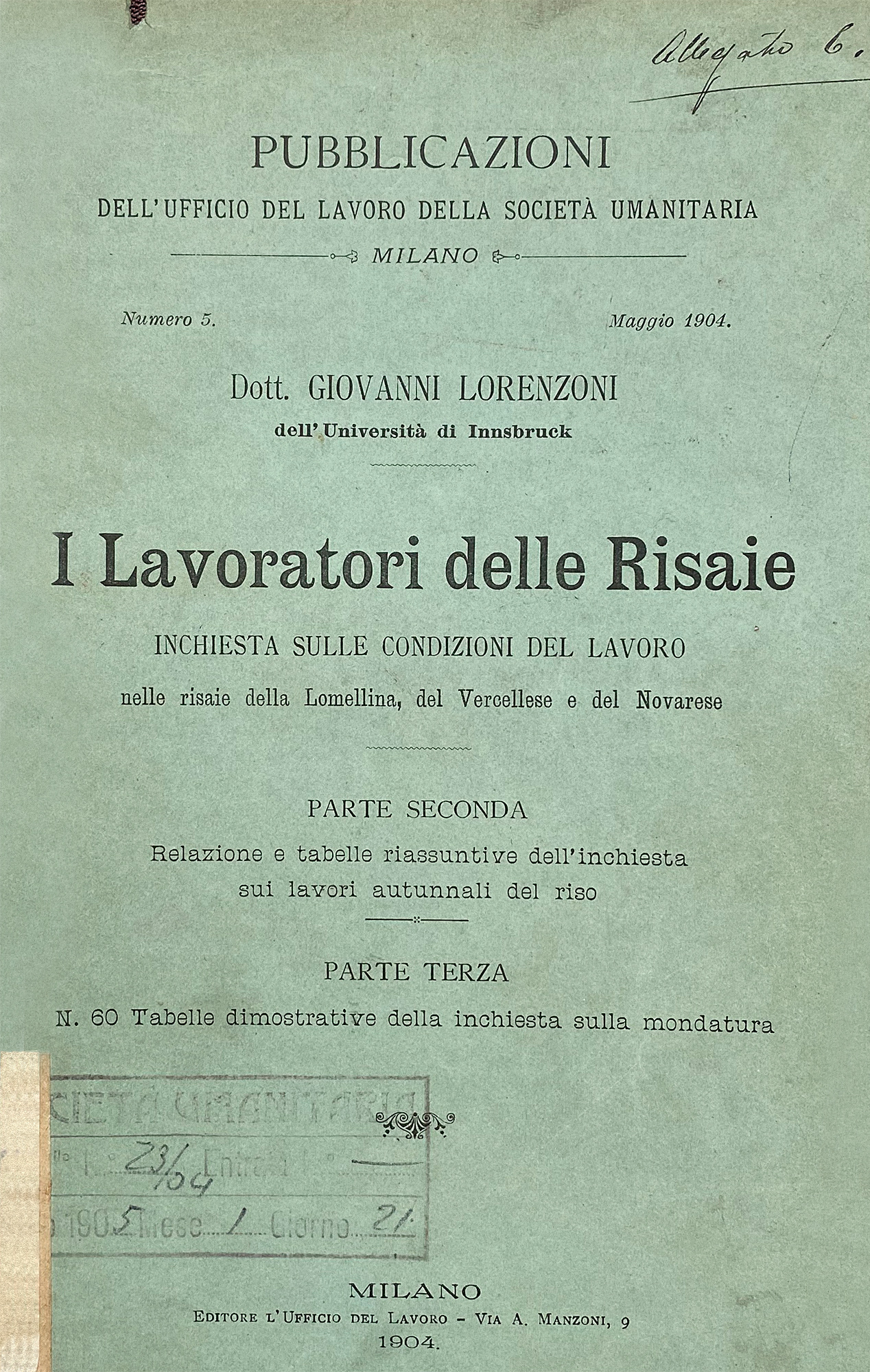 Inchiesta sulle Condizioni del Lavoro nelle risaie della Lomellina, del Vercellese e del Novarese, a cura del Dott. Giovanni Lorenzoni | Maggio 1904