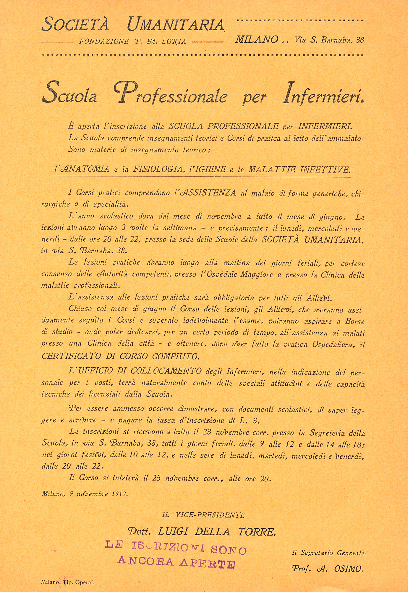 La rivista “L’Umanitaria” dà notizia dell’acquisto di un’area in Via S. Barnaba e del futuro trasferimento della sede ufficiale dal palazzo di Via Manzoni 9 (ex casa del Loria) nell’ex convento francescano di Via San Barnaba.