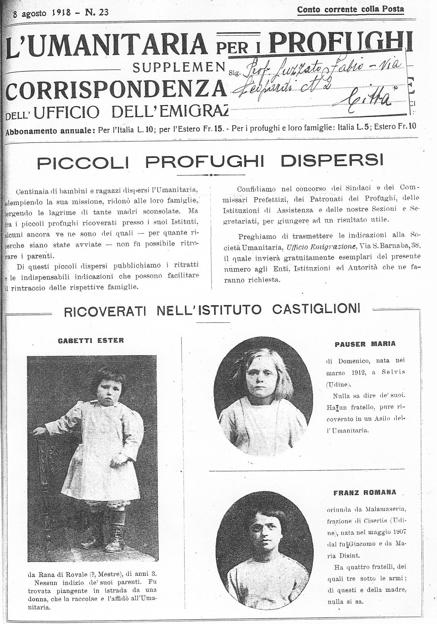 Con lo scoppio della Prima Guerra Mondiale l’Umanitaria decide di sospendere tutte le sue attività per dedicarsi completamente all’assistenza dei profughi di guerra. Da segnalare l’immensa opera per la difesa e la ricerca dei piccoli profughi dispersi, oltre 20.000 bambini assistiti.