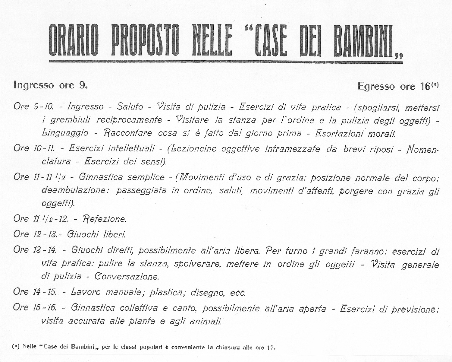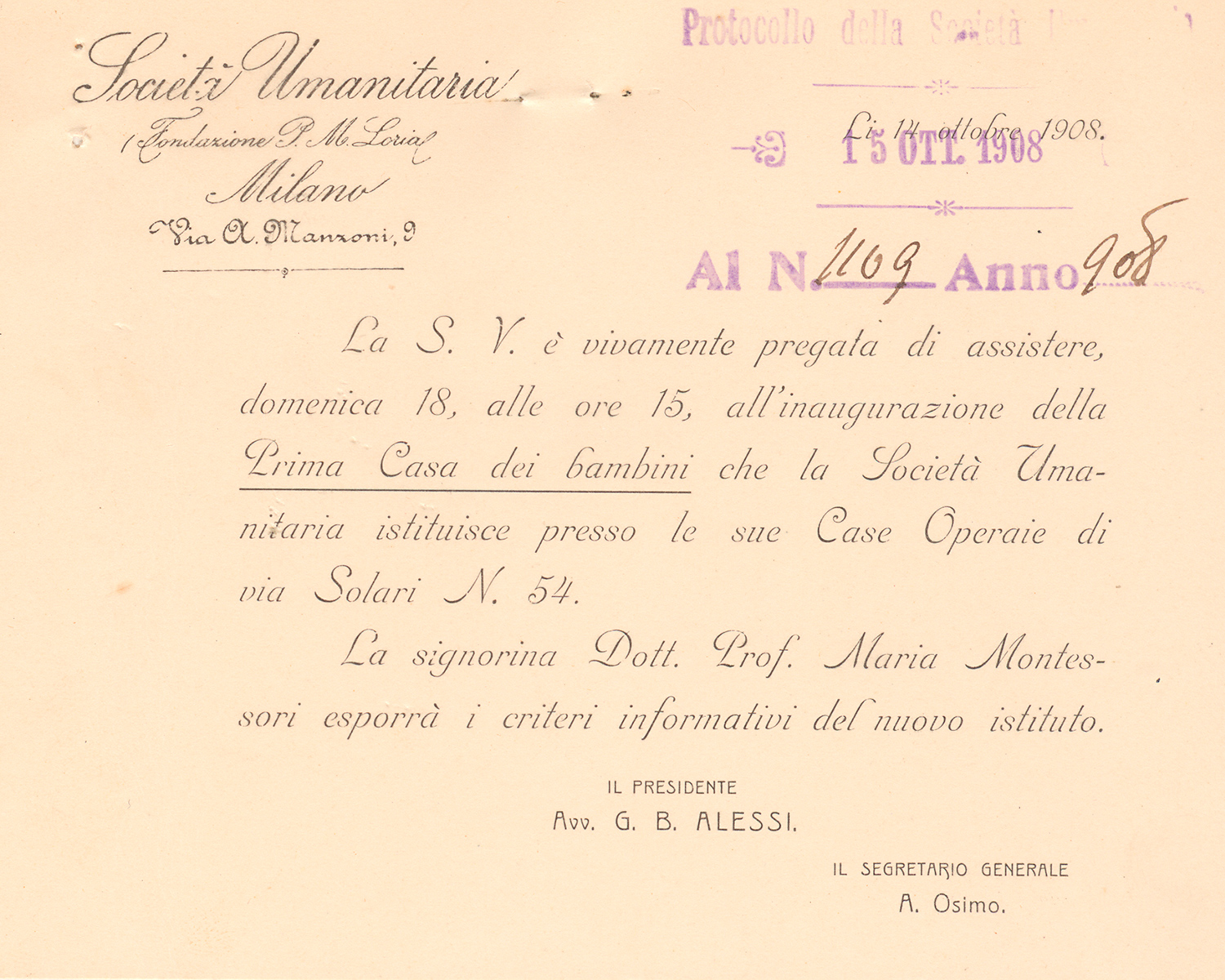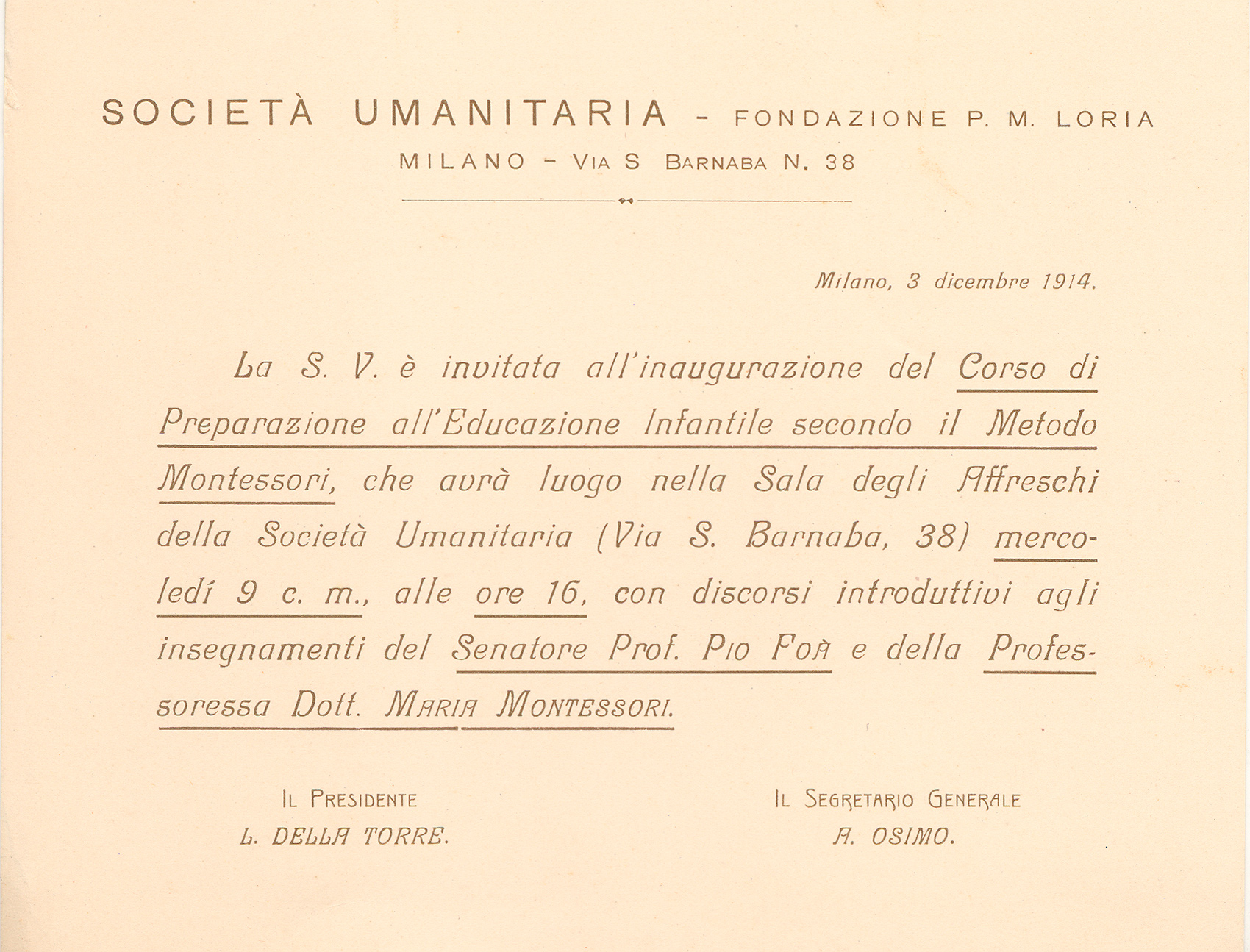 Sotto l’egida di Maria Montessori, nasce la prima Casa dei Bambini della Lombardia, nel quartiere operaio Solari. L’anno successivo, si inaugura quella nel quartiere Lombardia e, nel 1914, quella nella sede dell’Umanitaria. Il sodalizio con la Montessori prosegue negli anni sia per la fabbricazione dei materiali montessoriani, sia per la preparazione delle educatrici per l’infanzia.