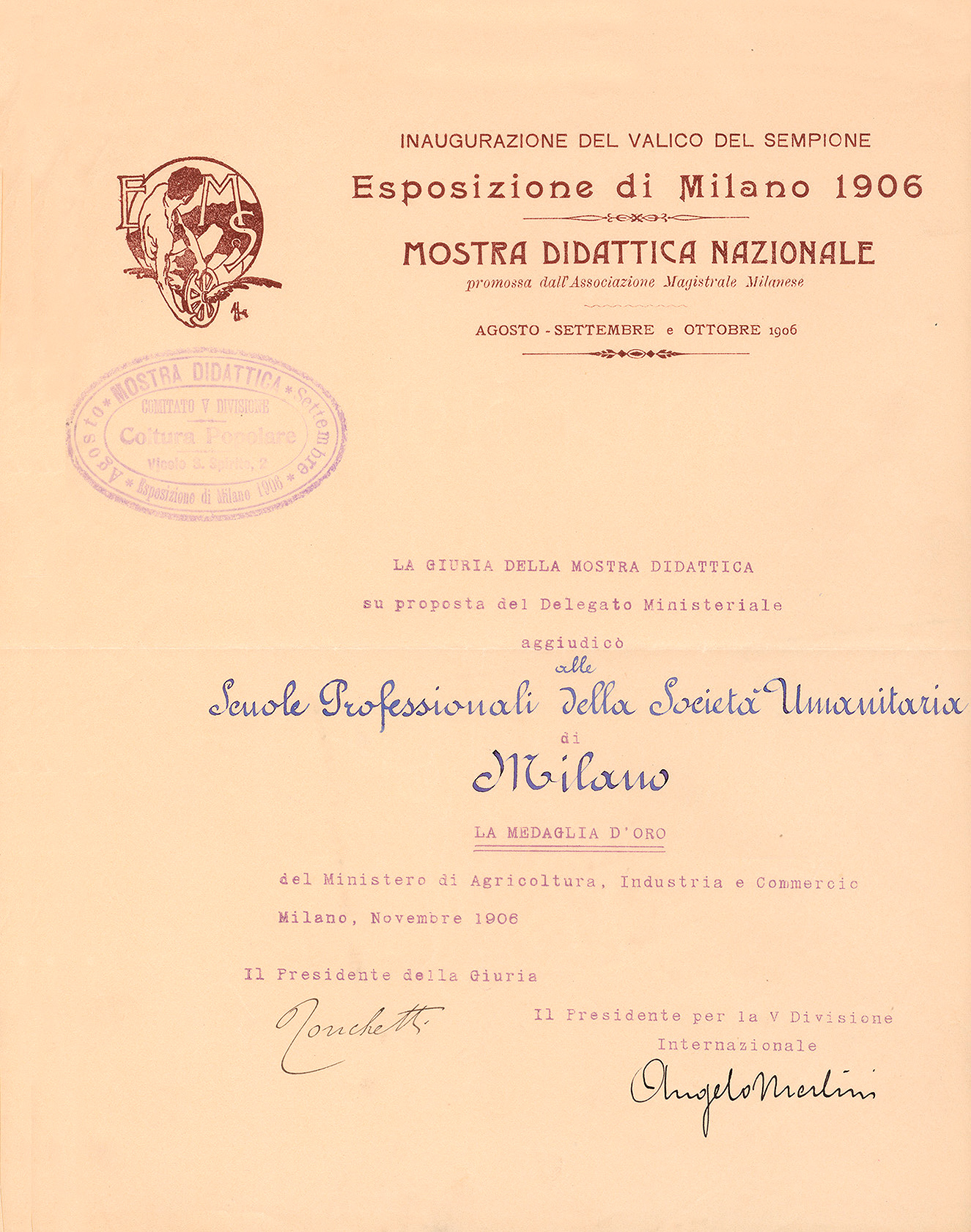 Tra i riconoscimenti ricevuti, la Medaglia d’oro per le scuole professionali.