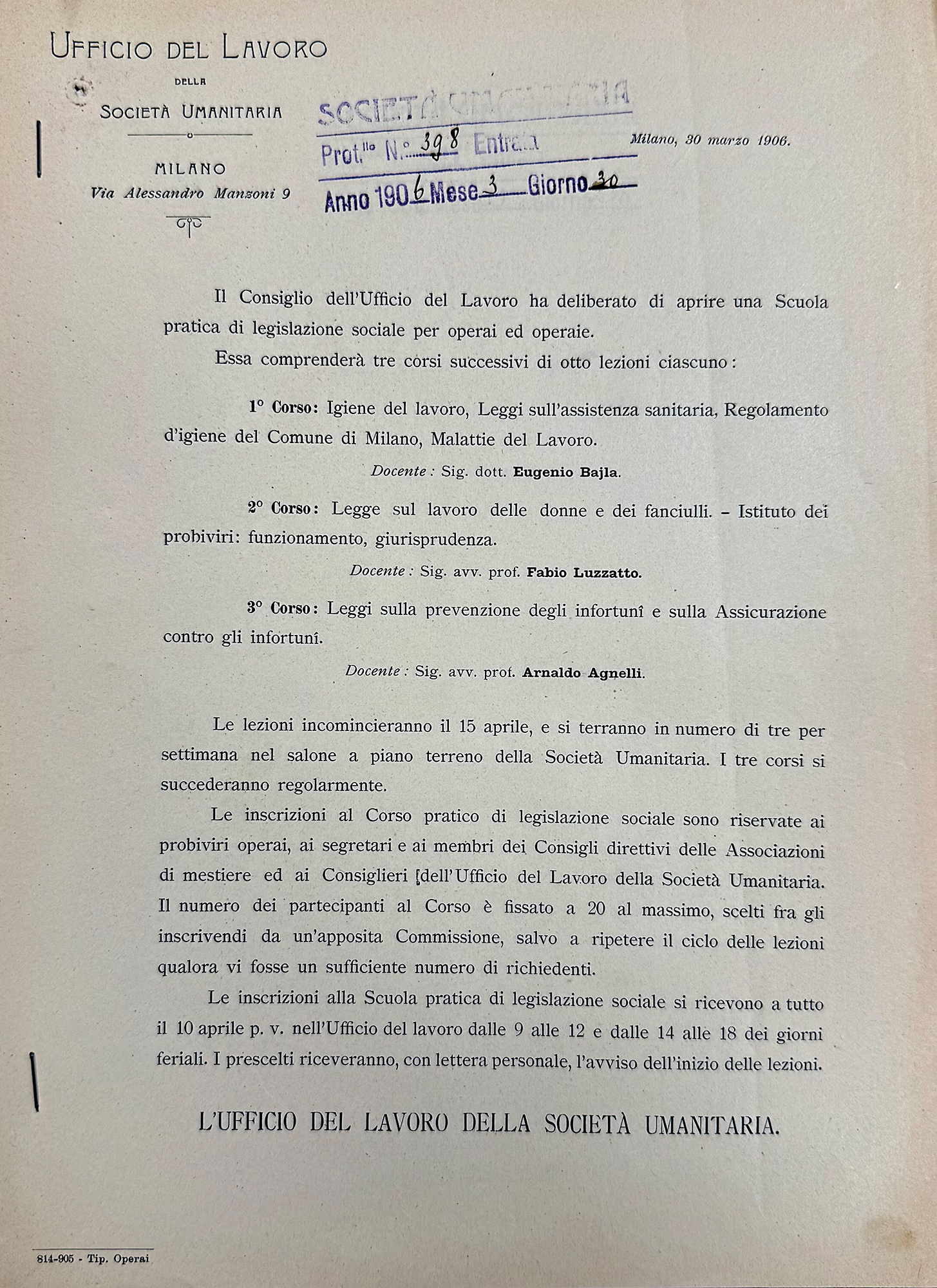 Iniziano le lezioni della Scuola pratica di legislazione sociale per operai. I corsi, serali e di durata biennale, mirano ad approfondire le competenze dei lavoratori in materia di igiene del lavoro, prevenzione degli infortuni, legislazione degli infortuni, legislazione sul lavoro delle donne e dei fanciulli.